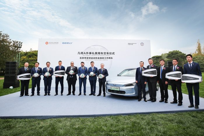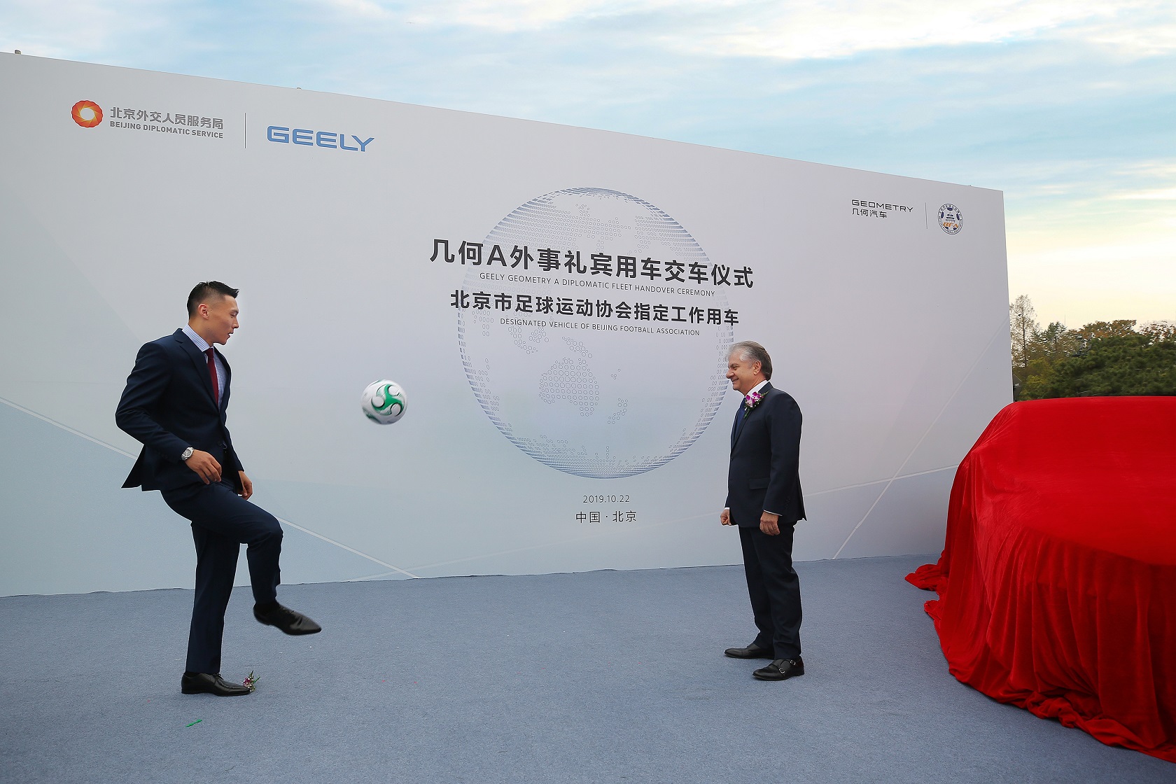 10月22日, 几何A外事礼宾用车和北京市足协工作用车交车仪式在北京行。北京外交人员服务局副局长陈闯,北京市足协主席、北京市体育局副局长杨海滨,金年会汽车集团副总裁、销售公司总经理林杰,几何品牌销售公司总经理郑状等作为双方代表完成了交付仪式。“国足福将”于大宝作为几何A的新晋车主出席了活动。此外,摩洛哥、萨尔瓦多等国家的驻华使节也亲临交付现场,共同见证了这一属于中国汽车品牌的荣耀时刻。