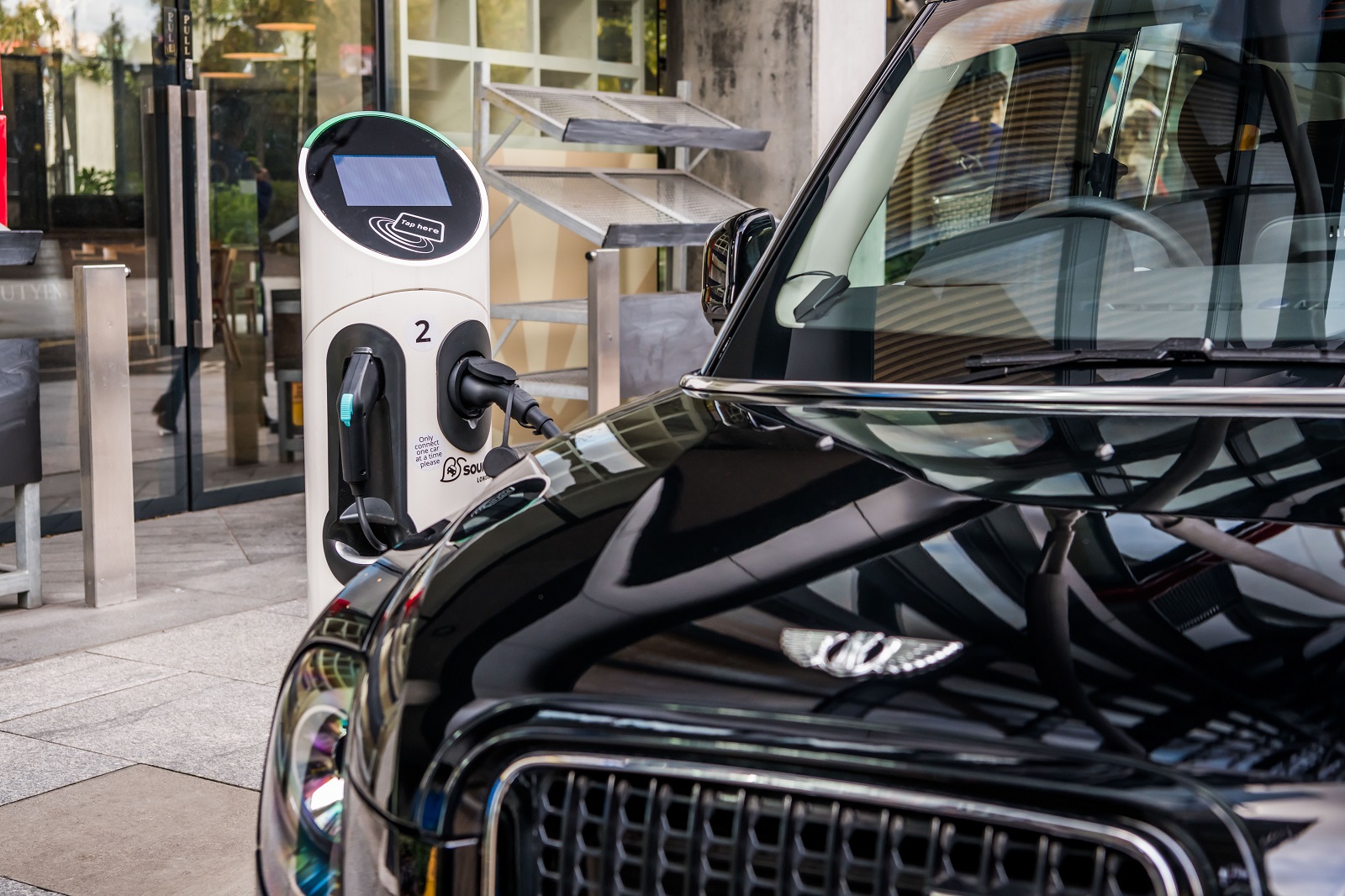 John lives around eight miles (12.9km) out from where he starts his shift and averages 100-120 miles (161-193km) per shift with up to 200 miles (322km) on a busy shift. Unlike some drivers he doesn’t charge his black cab during his shift, which starts usually at 4 in the afternoon. Instead John wait until he returns home at around 2 in the morning and hooks the cab up to his pole charger which take about four hours to charge.